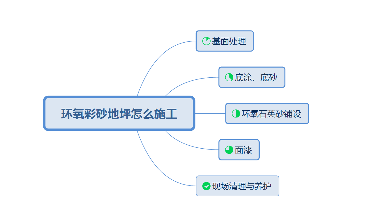 環氧彩砂地坪施工大致分為五大步驟,分別是基面處理、底涂/底砂、環氧石英砂鋪設、面漆以及現場清理與養護,為了方便大家的了解,下面就帶著大家詳細的了解一下!